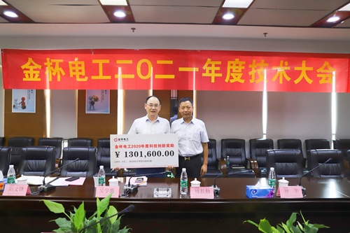 隨后楊志強首席技術專家宣讀了2020年度科技獎勵文件,吳學愚董事長給技術人員代表--集團總工程師陽文鋒同志親自頒發了130.16萬元科技創新獎勵。這份獎勵既是公司對技術創新工作的高度認可和評價,也是全體技術人員自身創新價值的激勵體現。